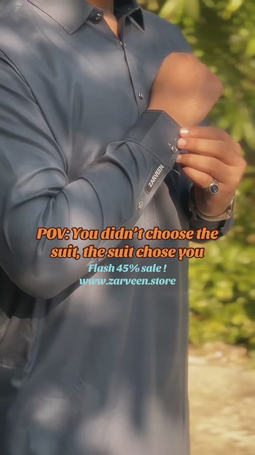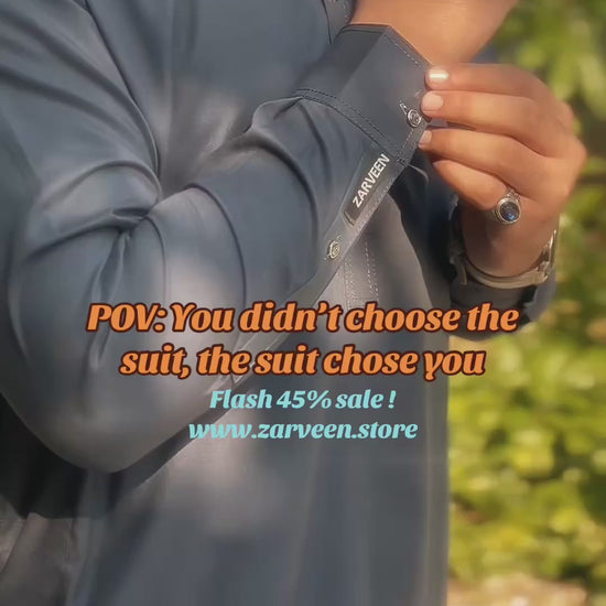 The two-piece set (kameez & shalwar) is detailed with premium double stitching in silk thread, adding both strength and finesse to your attire. Its unique greyish-navy shade stands out as subtle yet stylish – a color that speaks of sophistication and confidence without being loud. Carefully packed in exclusive Zarveen packaging, this suit is a statement piece for gentlemen who admire fine details, comfort, and timeless appeal.